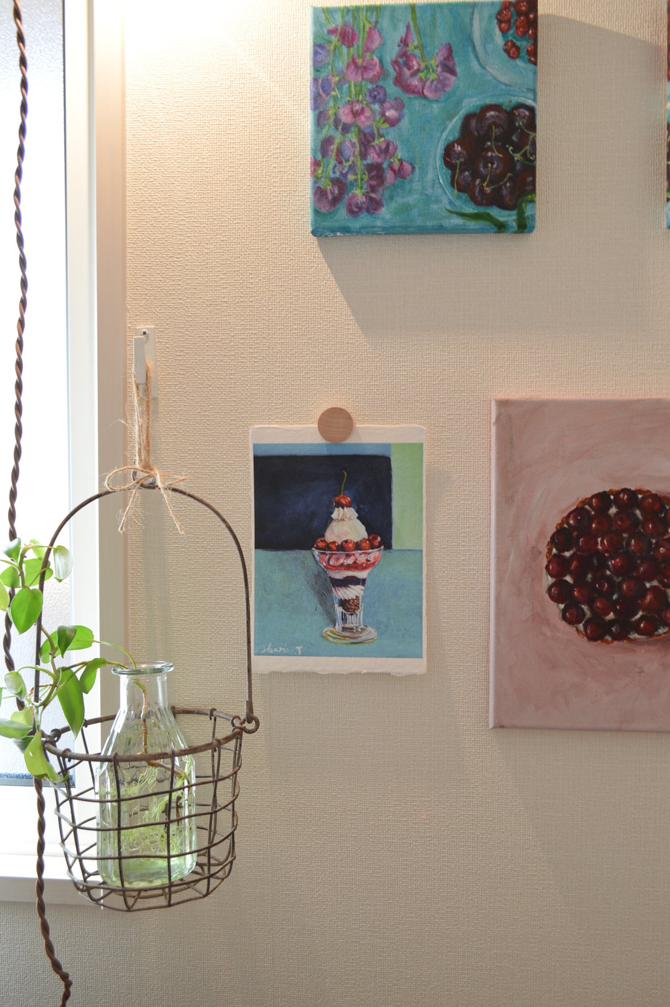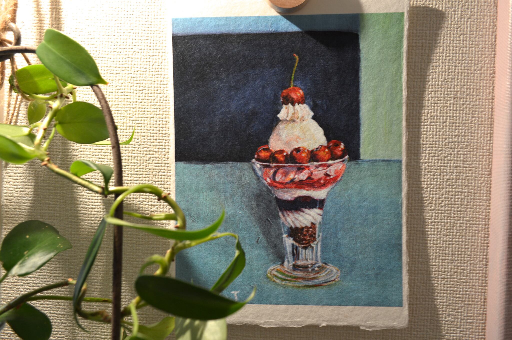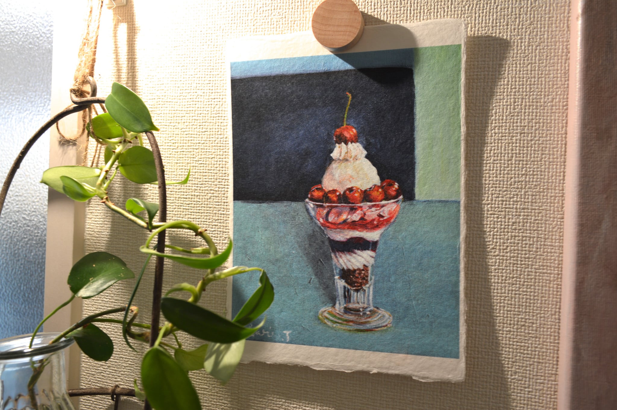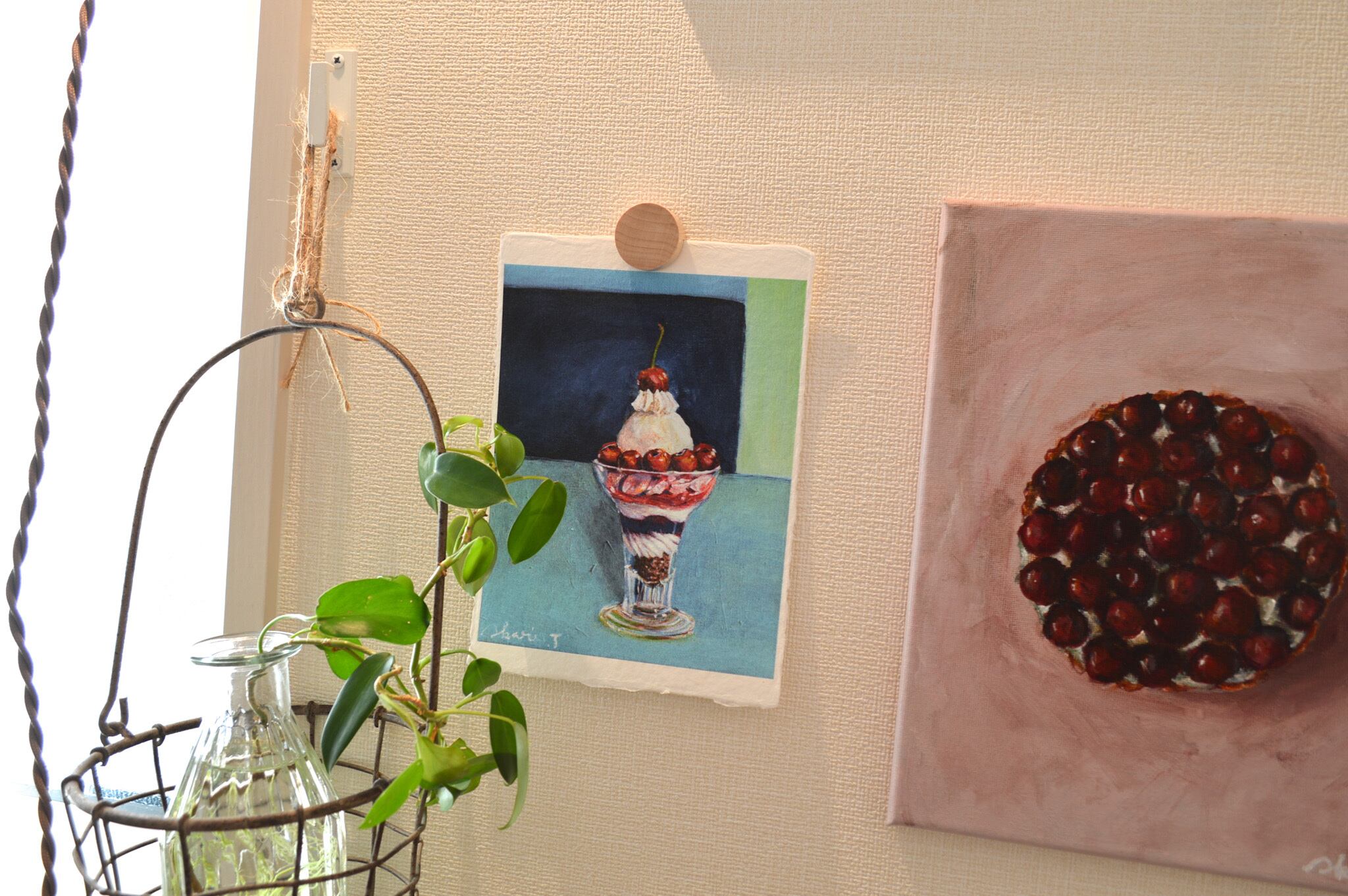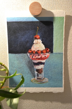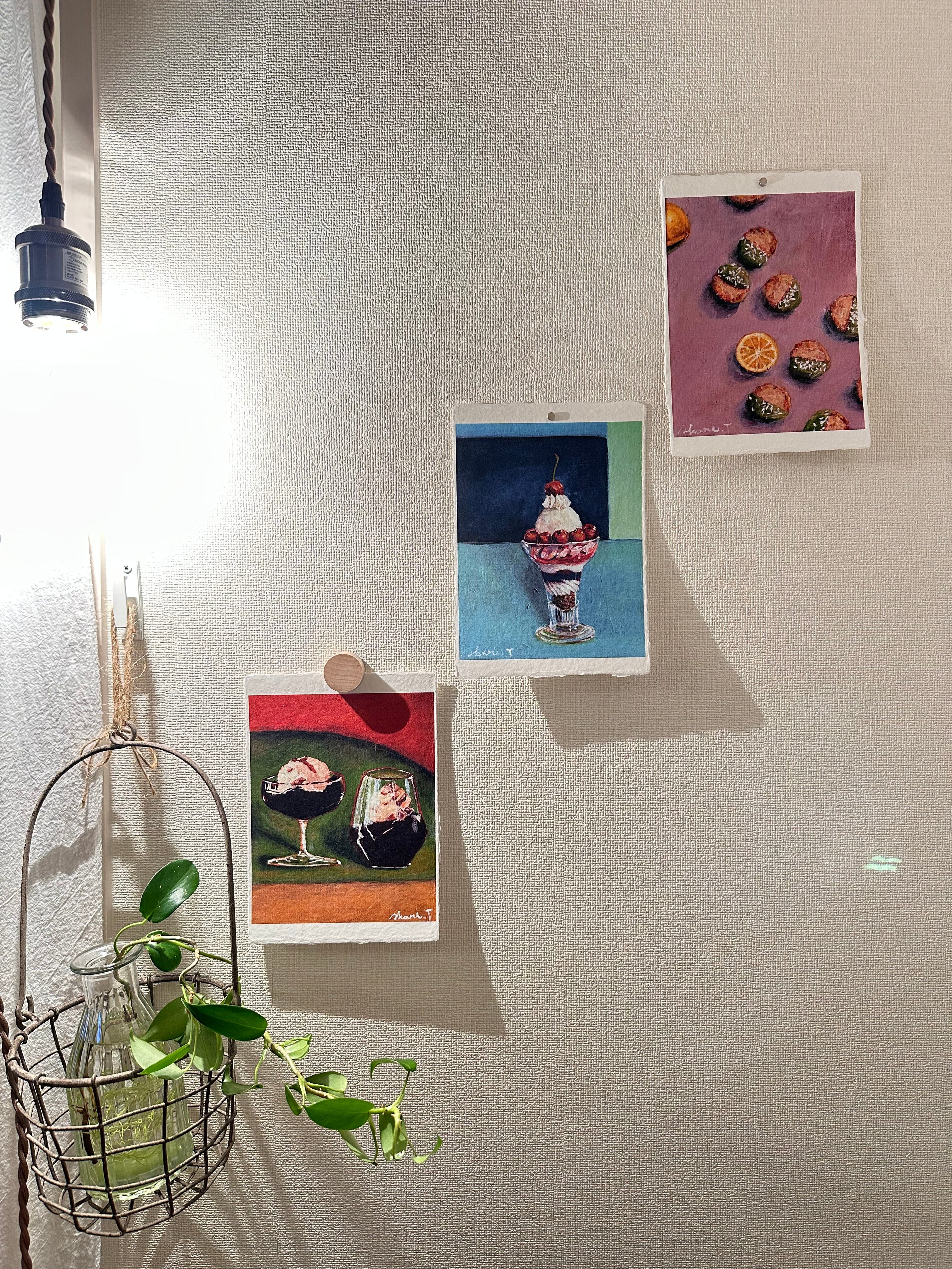 〈ひかりのかけら〉は、日本の伝統配色で洋菓子を描くアクリル画「微美(びみ)」シリーズから生まれた、和紙のミニアートです。