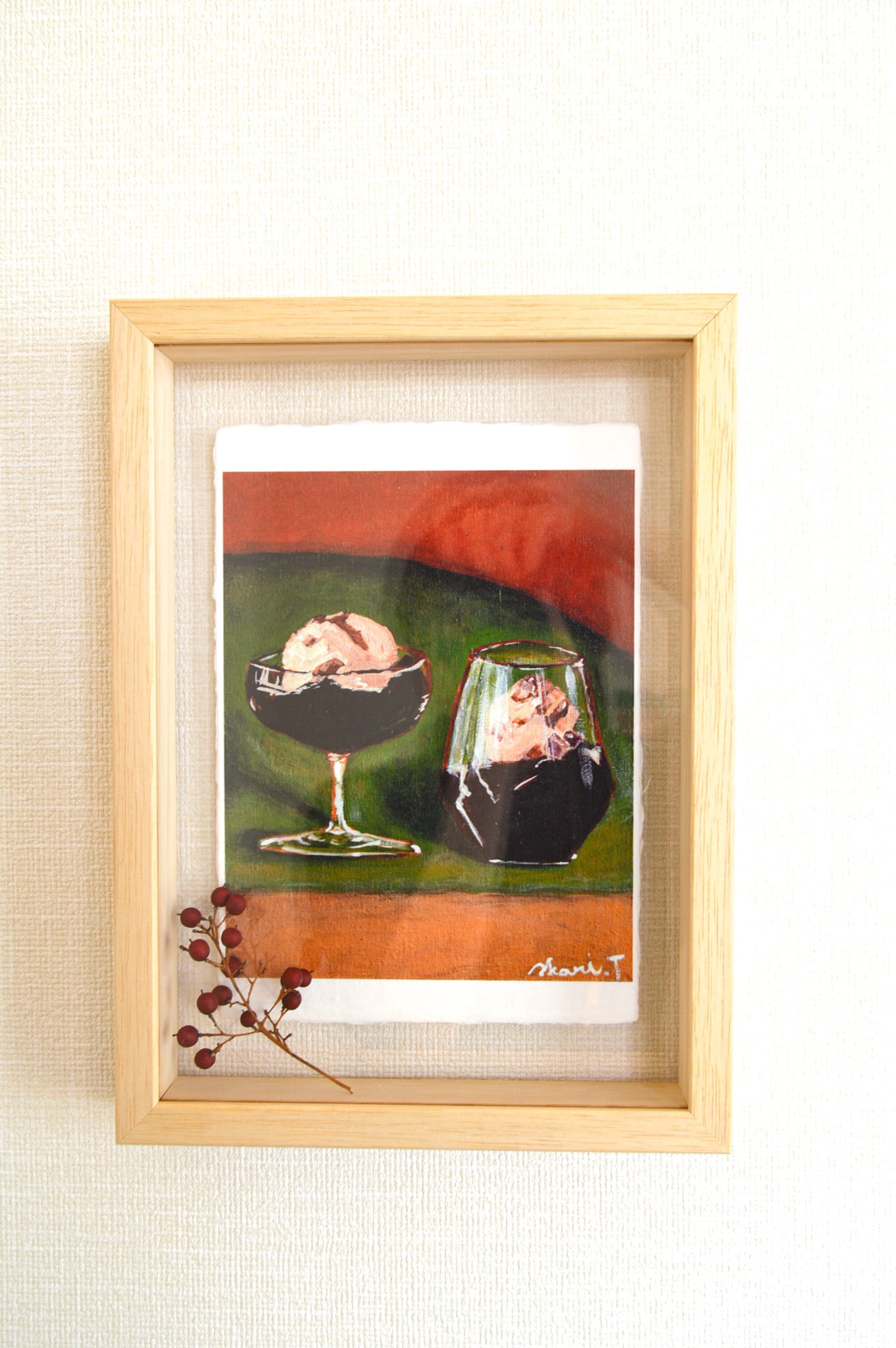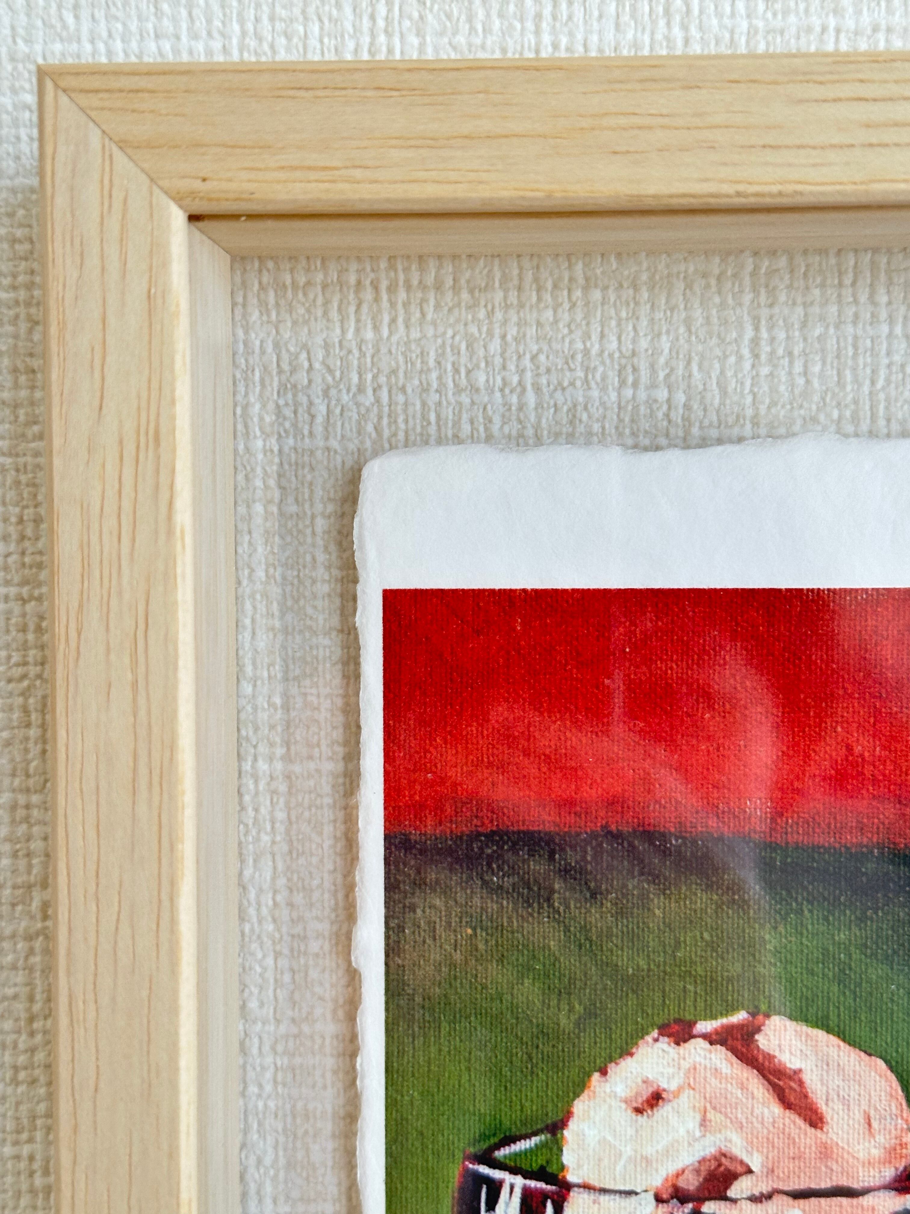 作品より少し大きめのボックス額なので和紙の耳も見せつつ、額の奥行きを活かして植物など立体物を入れていただくこともできます。