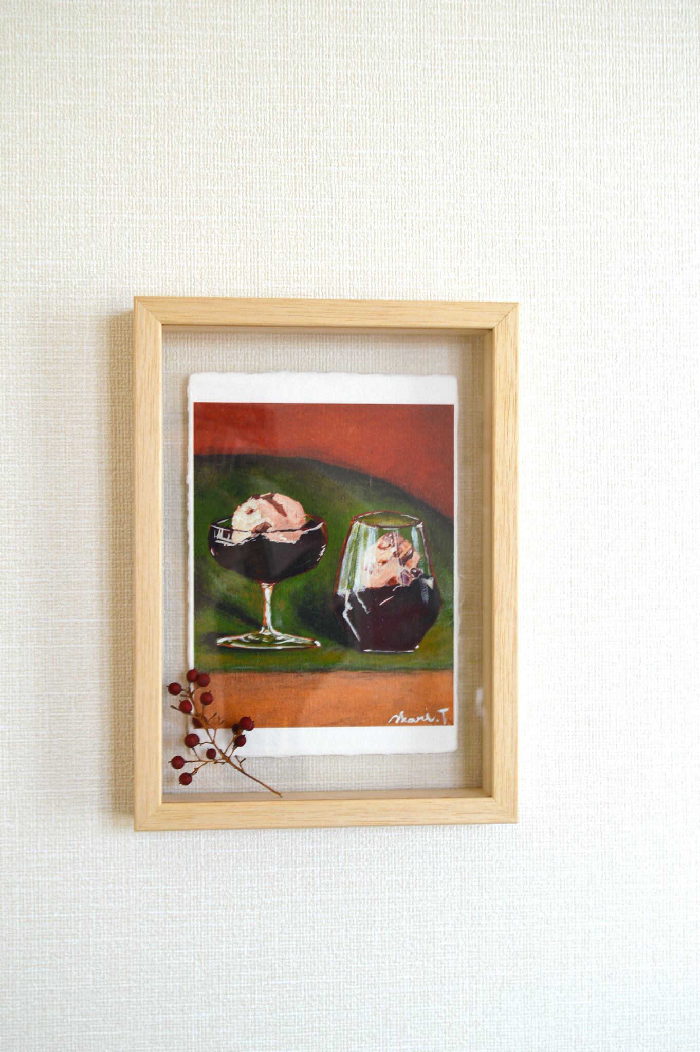作品より少し大きめのボックス額なので和紙の耳も見せつつ、額の奥行きを活かして植物など立体物を入れていただくこともできます。