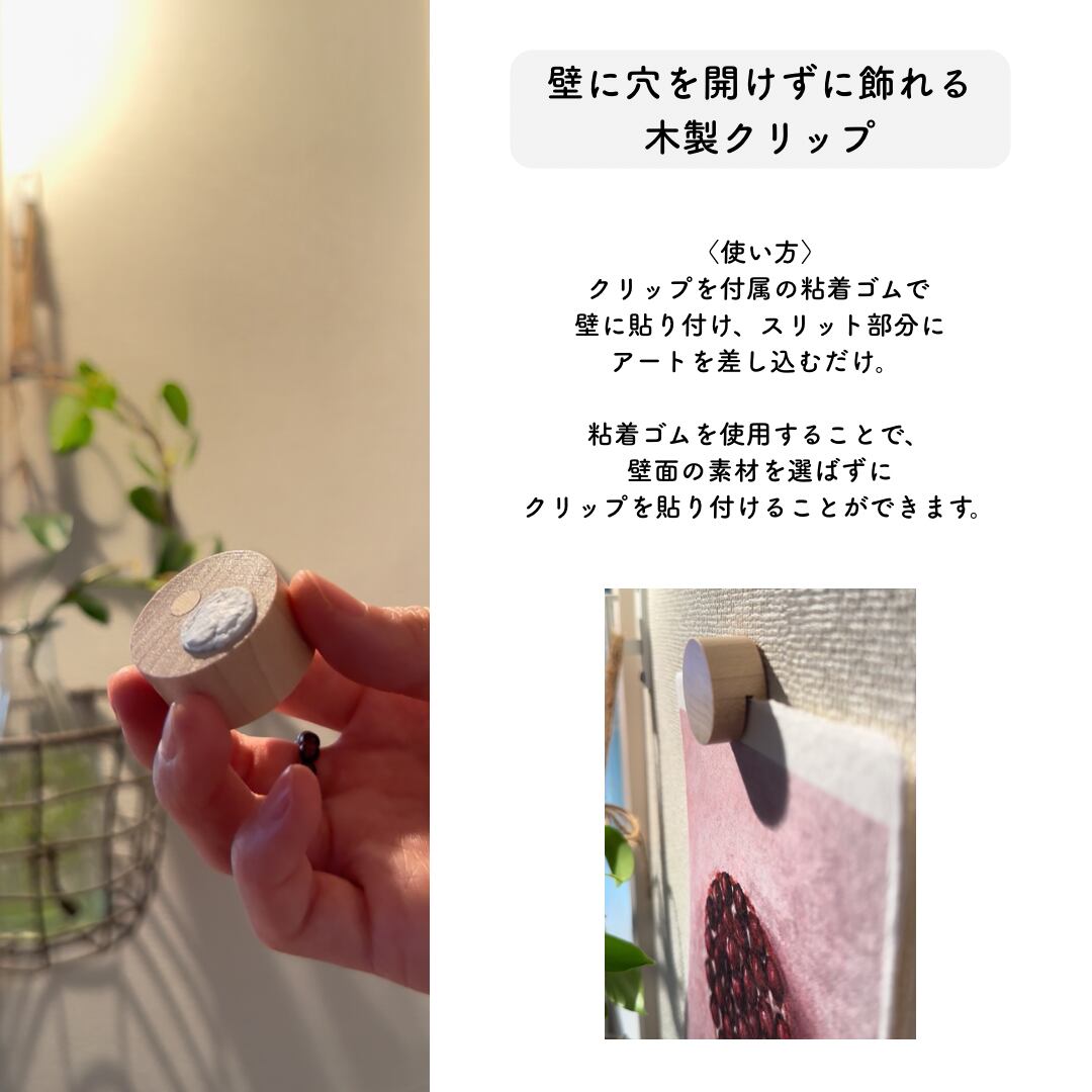 木製のクリップを付属の粘着ゴムで壁に貼り付け、スリット部分にアートを差し込むだけで簡単に飾ることができます。