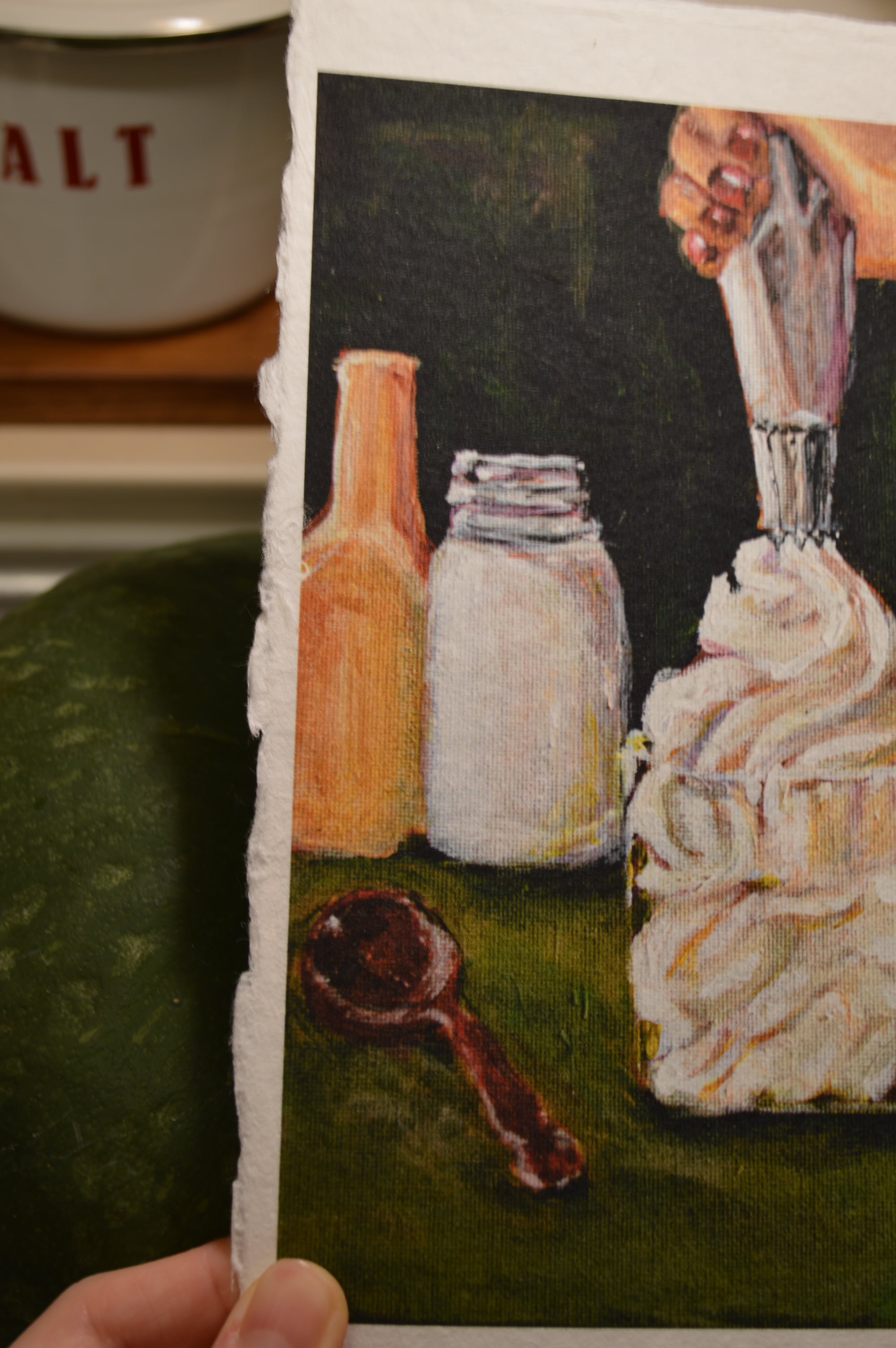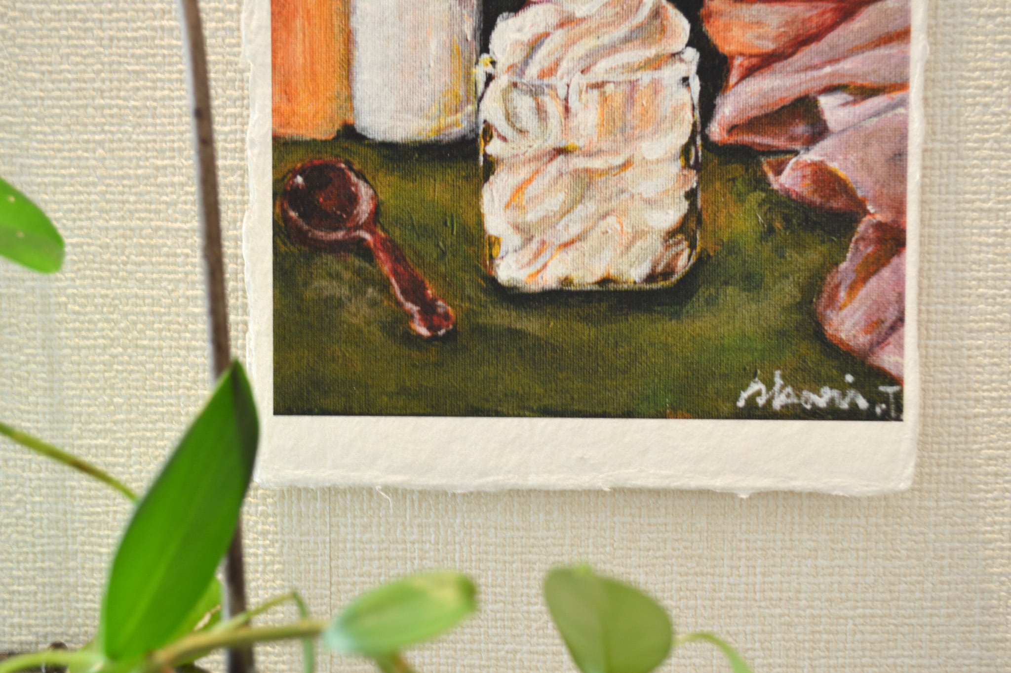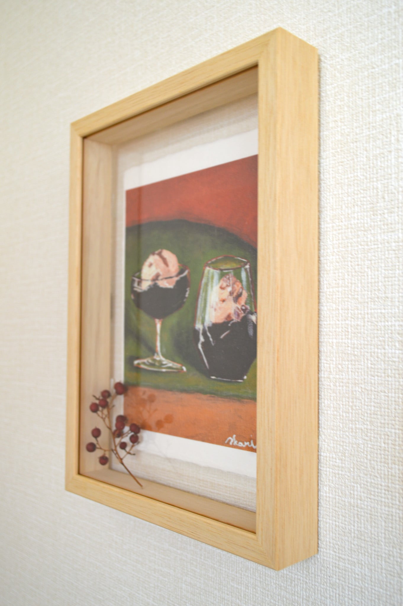 作品より少し大きめのボックス額なので和紙の耳も見せつつ、額の奥行きを活かして植物など立体物を入れていただくこともできます。