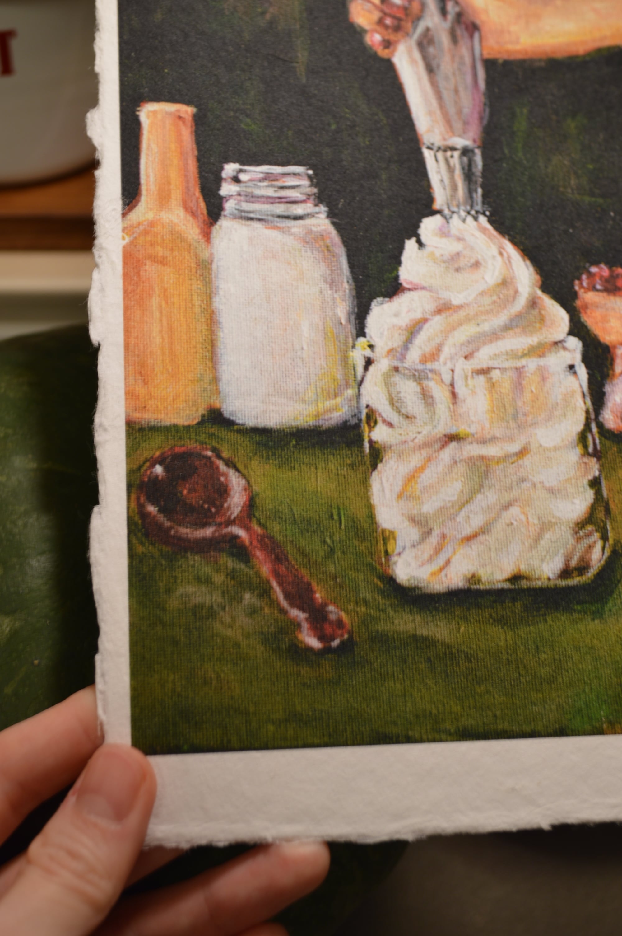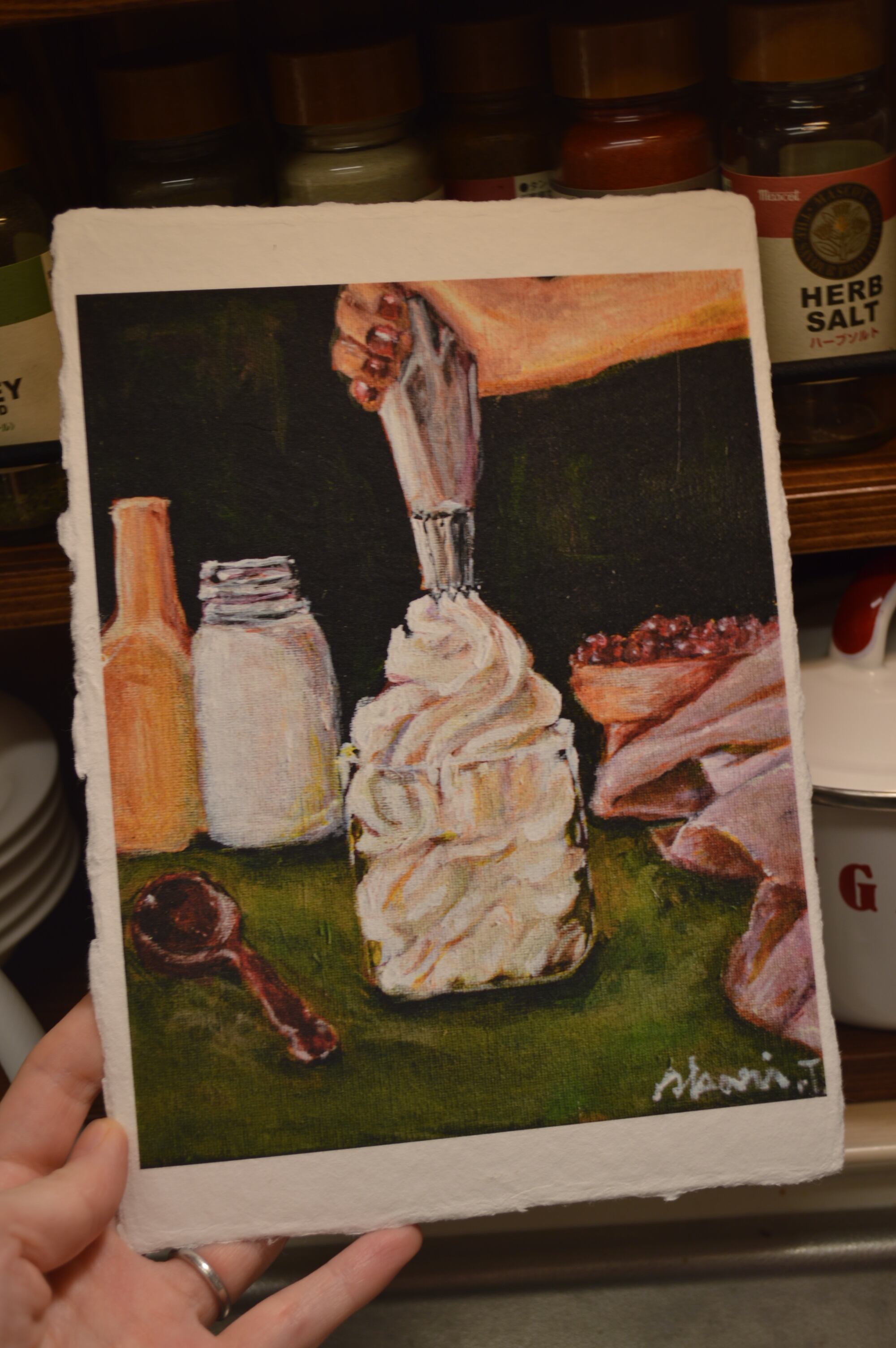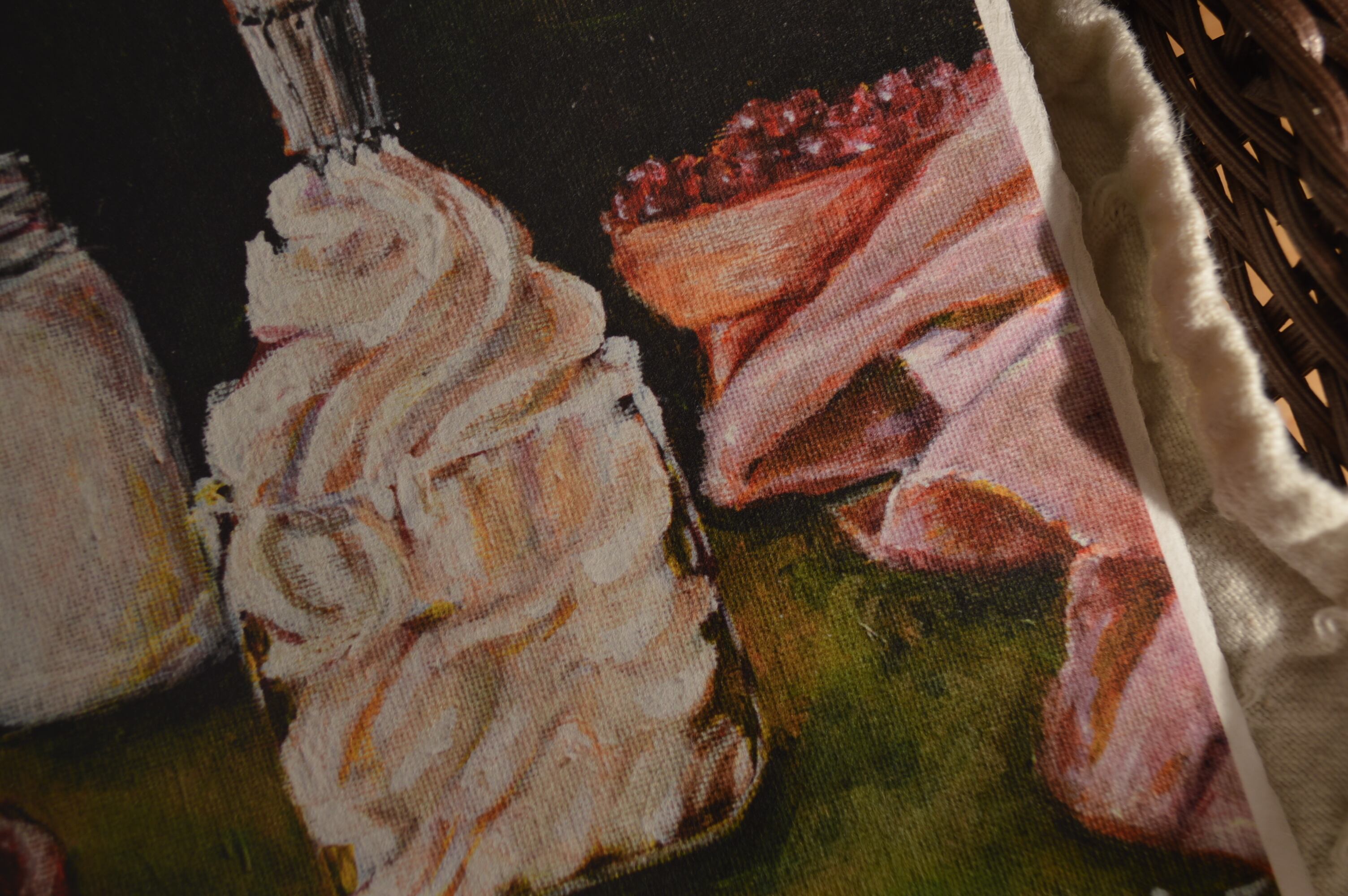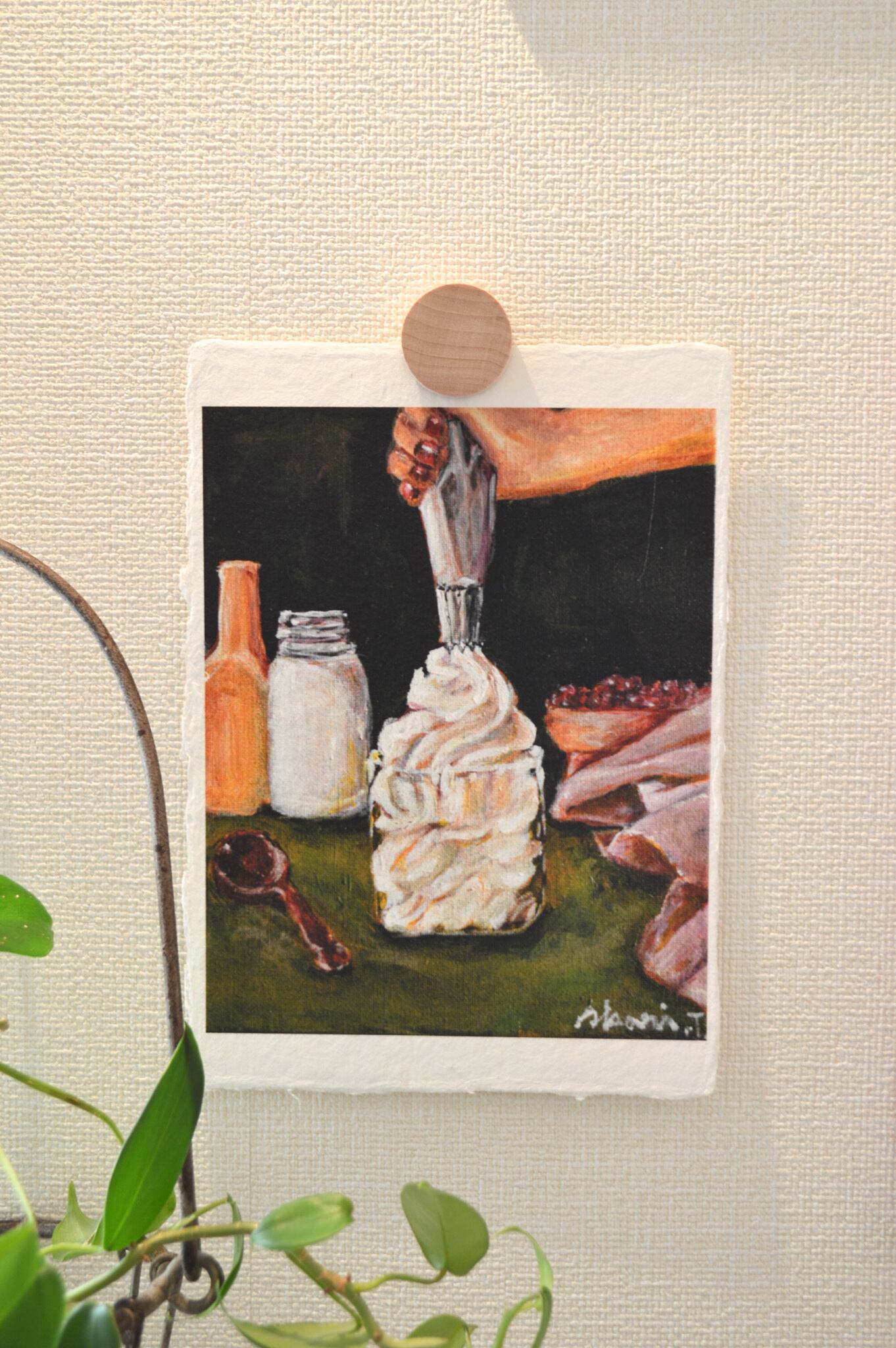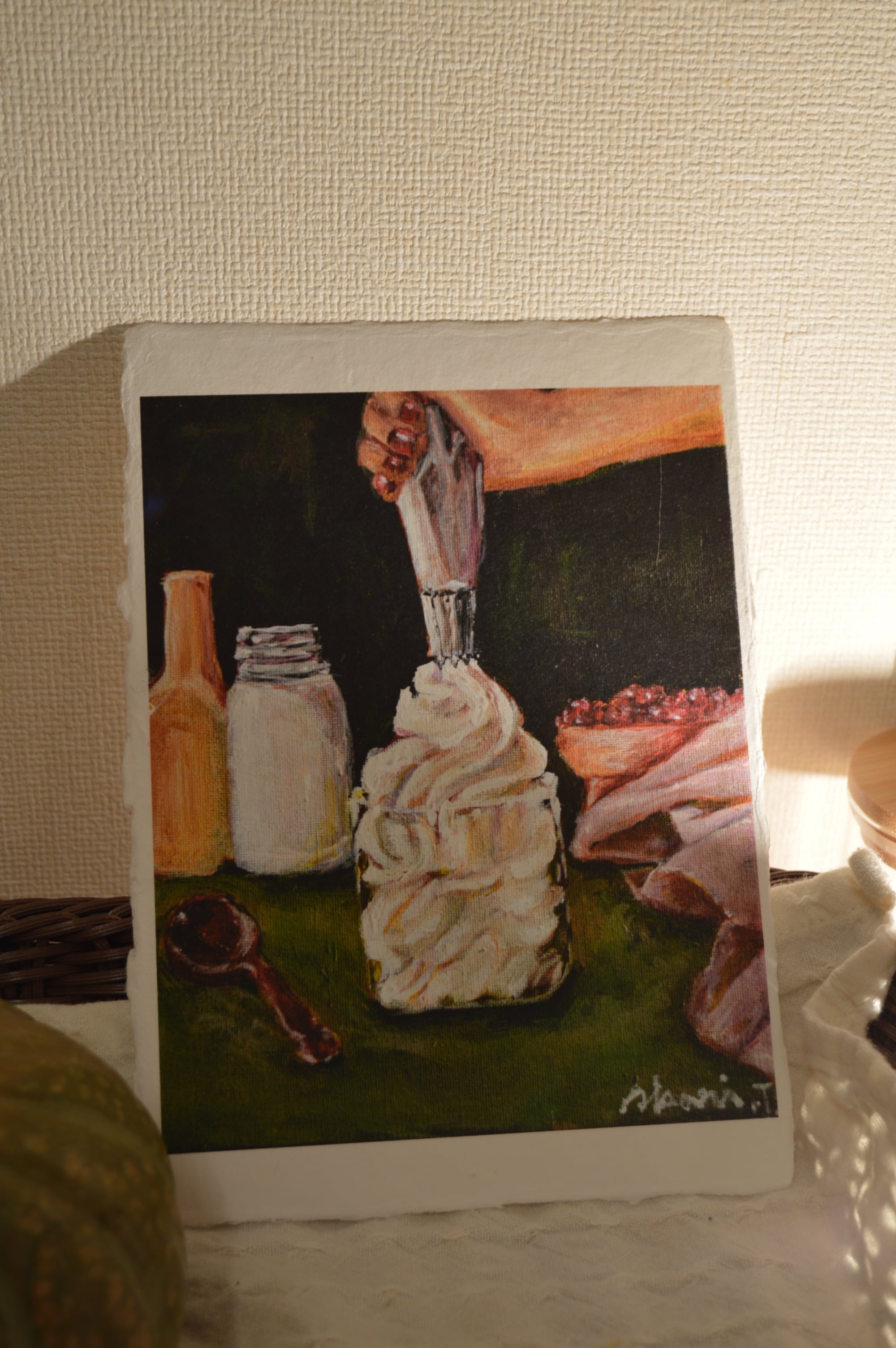 〈ひかりのかけら〉は、日本の伝統配色で洋菓子を描くアクリル画「微美(びみ)」シリーズから生まれた、和紙のミニアートです。